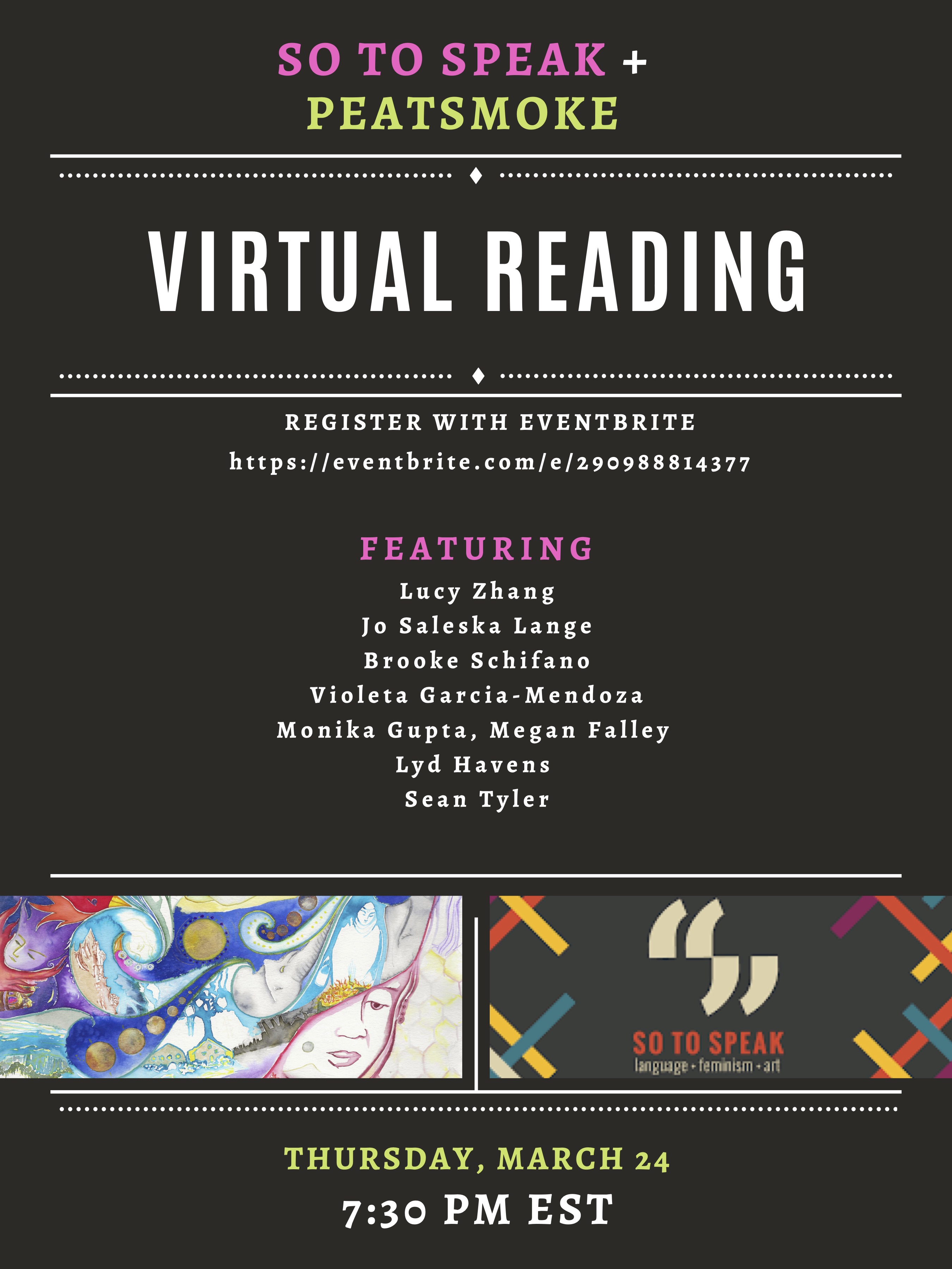 Virtual Reading with Peatsmoke Journal 3/24/2022 I am reading at 4:30 PT/7:30 ET with Peatsmoke journal today. https://gmu.zoom.us/j/98786496007#success Share this: Click to share on X (Opens in new window) X Click to share on Facebook (Opens in new window) Facebook Like Loading... Published by Lucy Zhang View all posts by Lucy Zhang