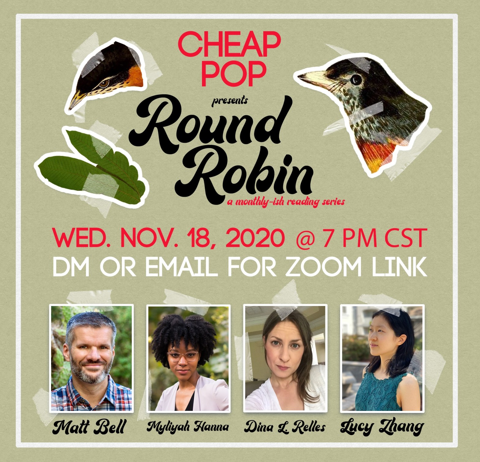 I’ll be doing my first ever virtual reading with these brilliant writers on Wednesday 11/18 @ 7 pm CST! If you’d like to join in on the fun and watch me stumble over all my words, email cheappoplit@gmail.com for Zoom details.